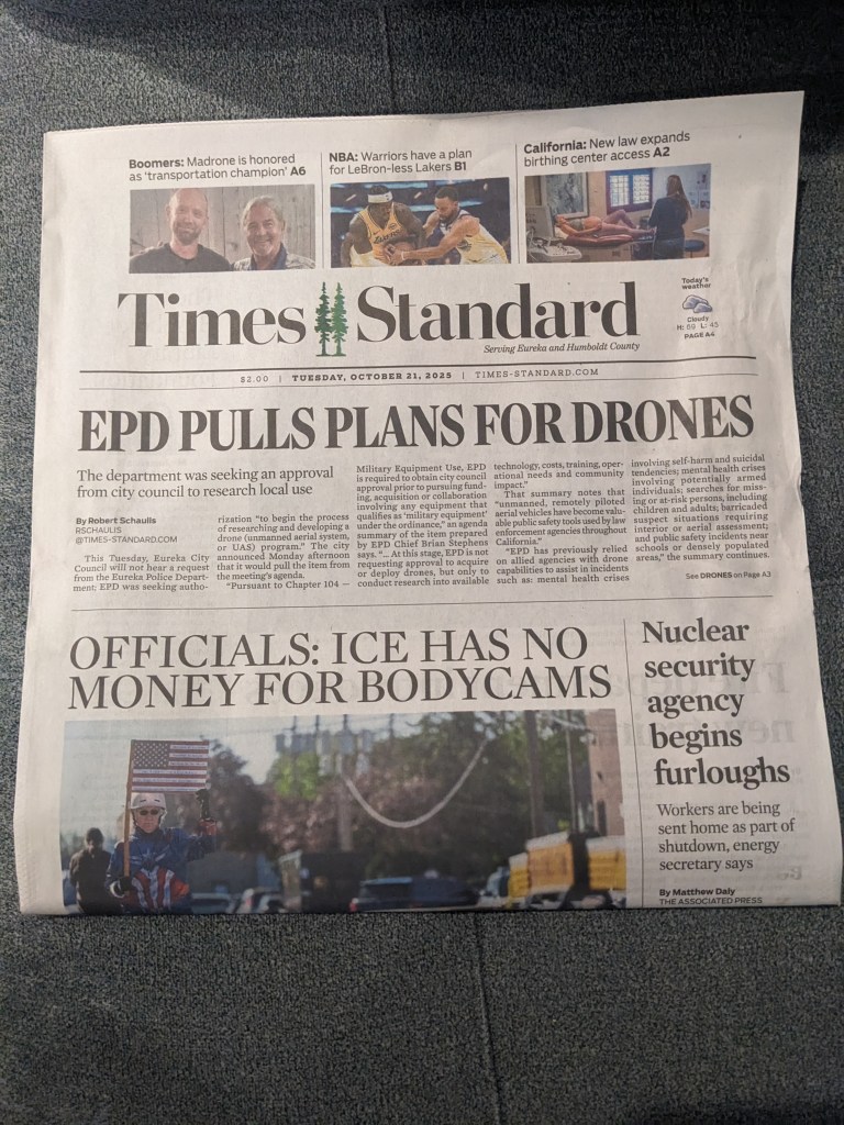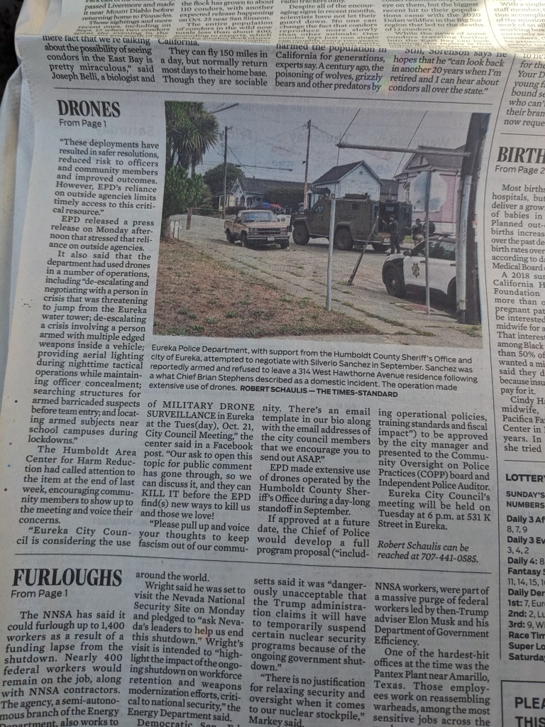 The Eureka Police Department (EPD) is the largest local law enforcement agency in our region, and is responsible for maintaining public safety in our community. Recently, they have submitted a request to the Eureka City Council seeking permission to research and develop a military-style drone surveillance program.