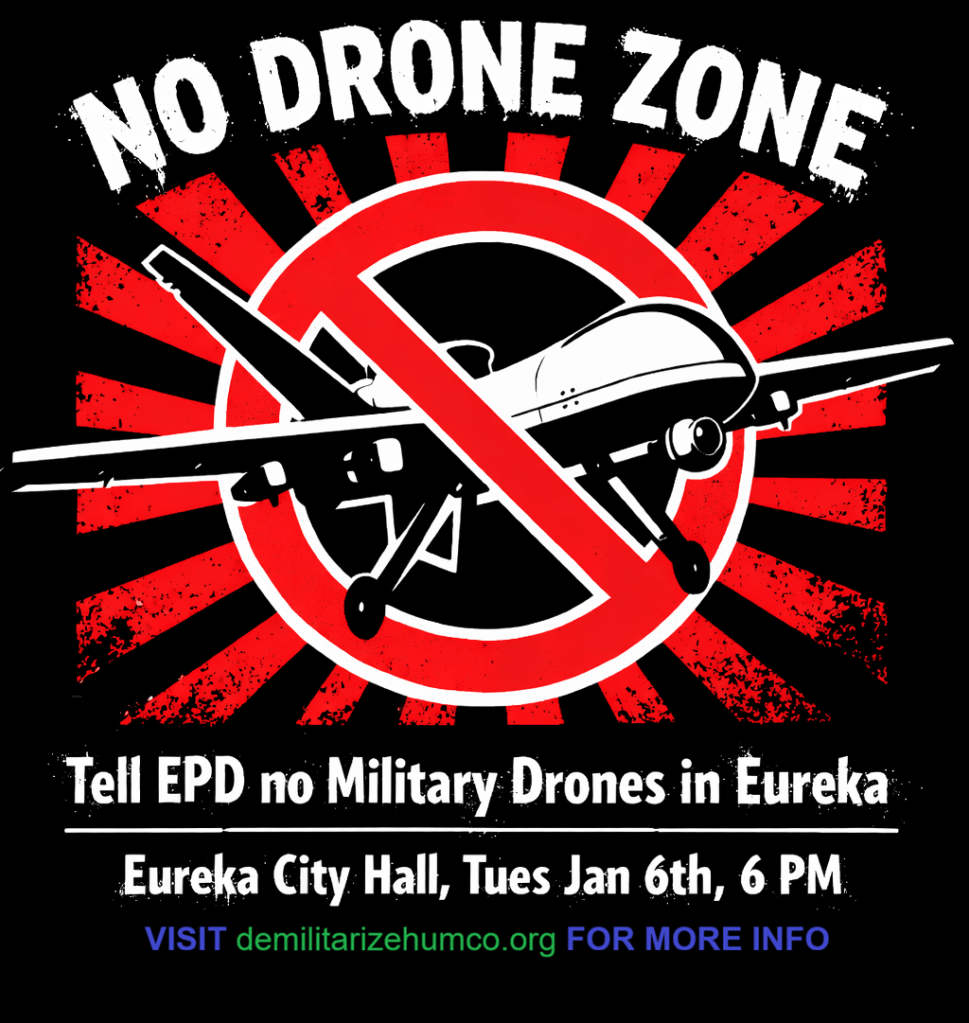 The Eureka Police Department’s proposal to research a drone surveillance program has been removed from the consent calendar but remains on the agenda for discussion and a possible vote. Community voices are crucial—please urge the Council to VOTE NO.